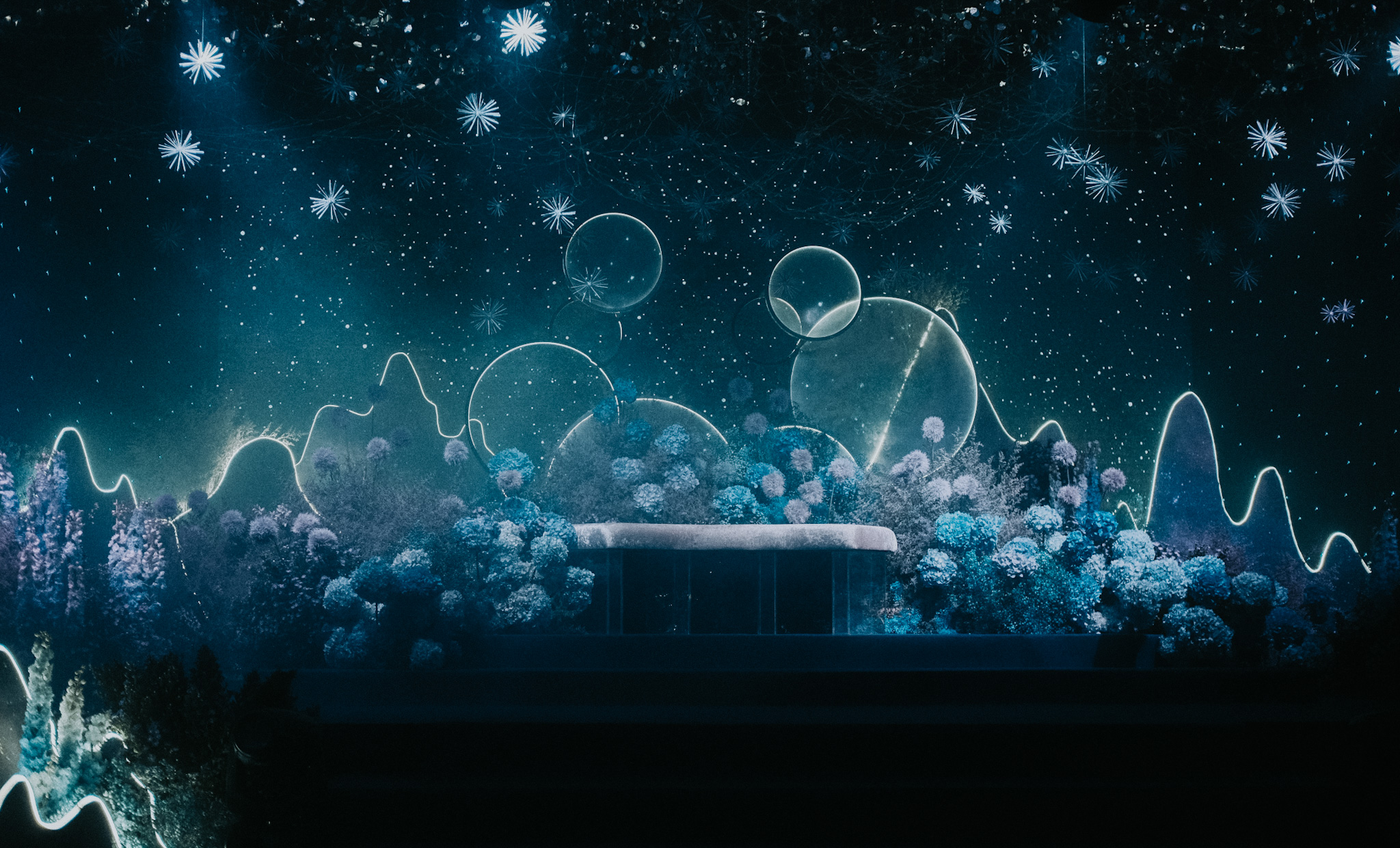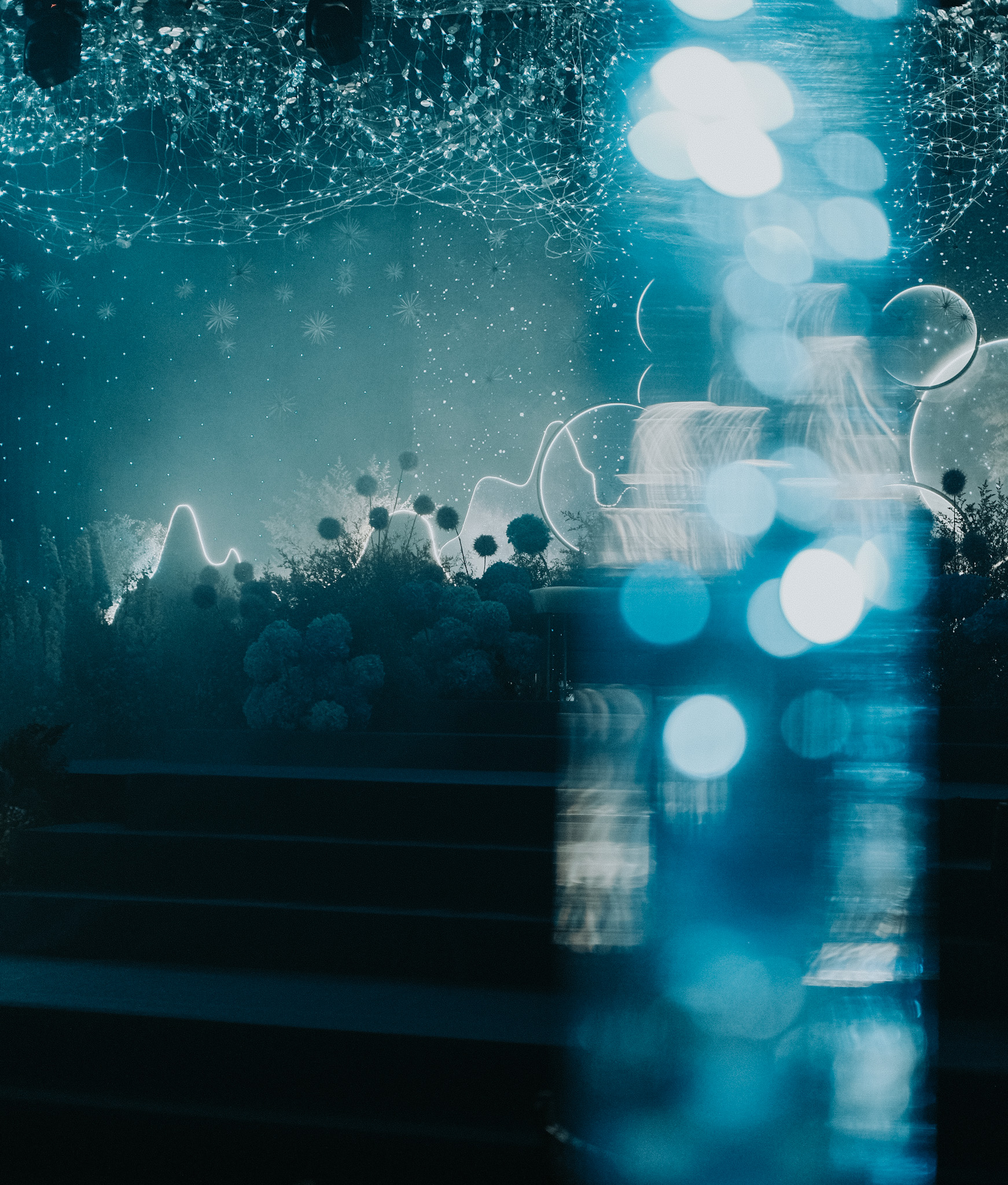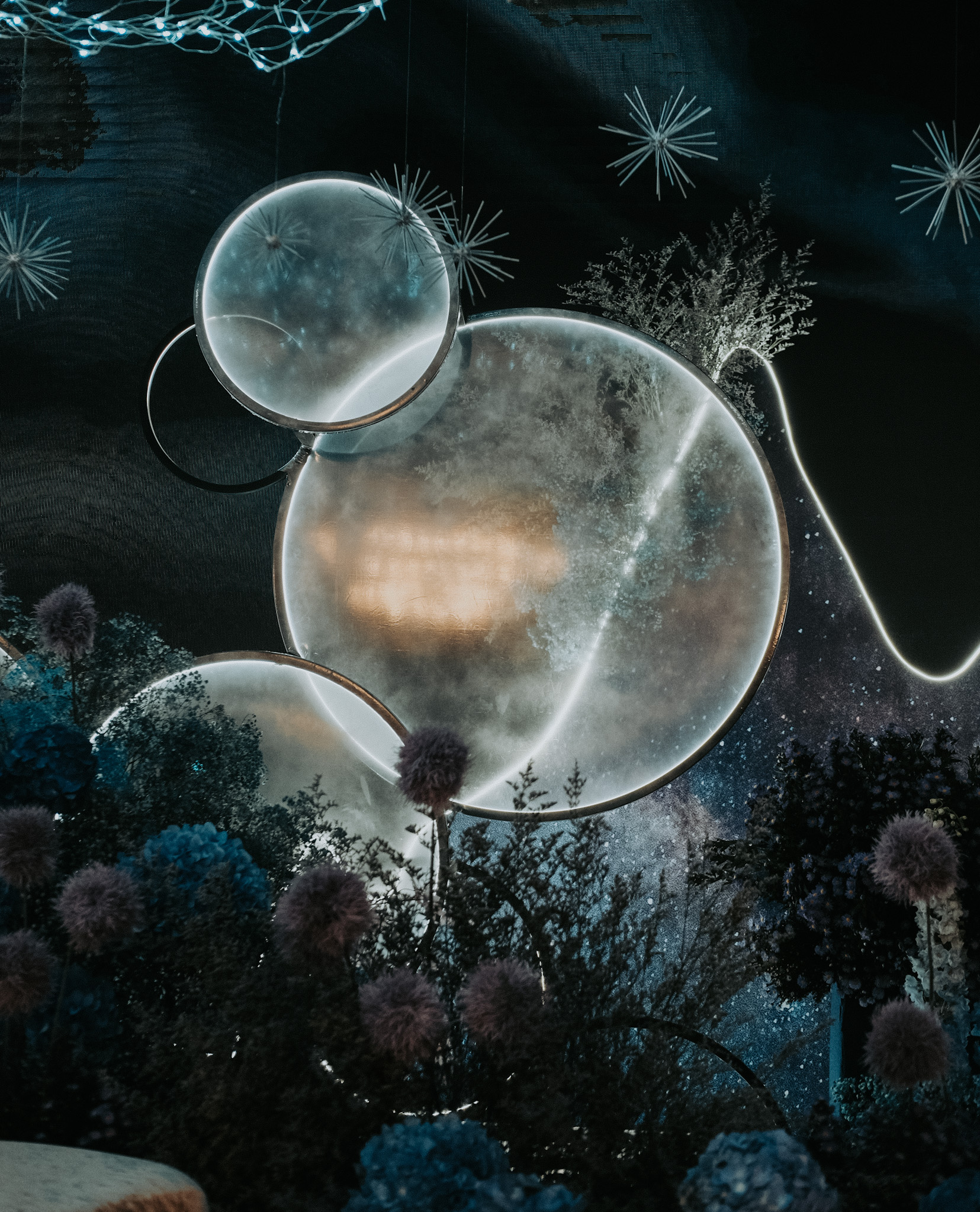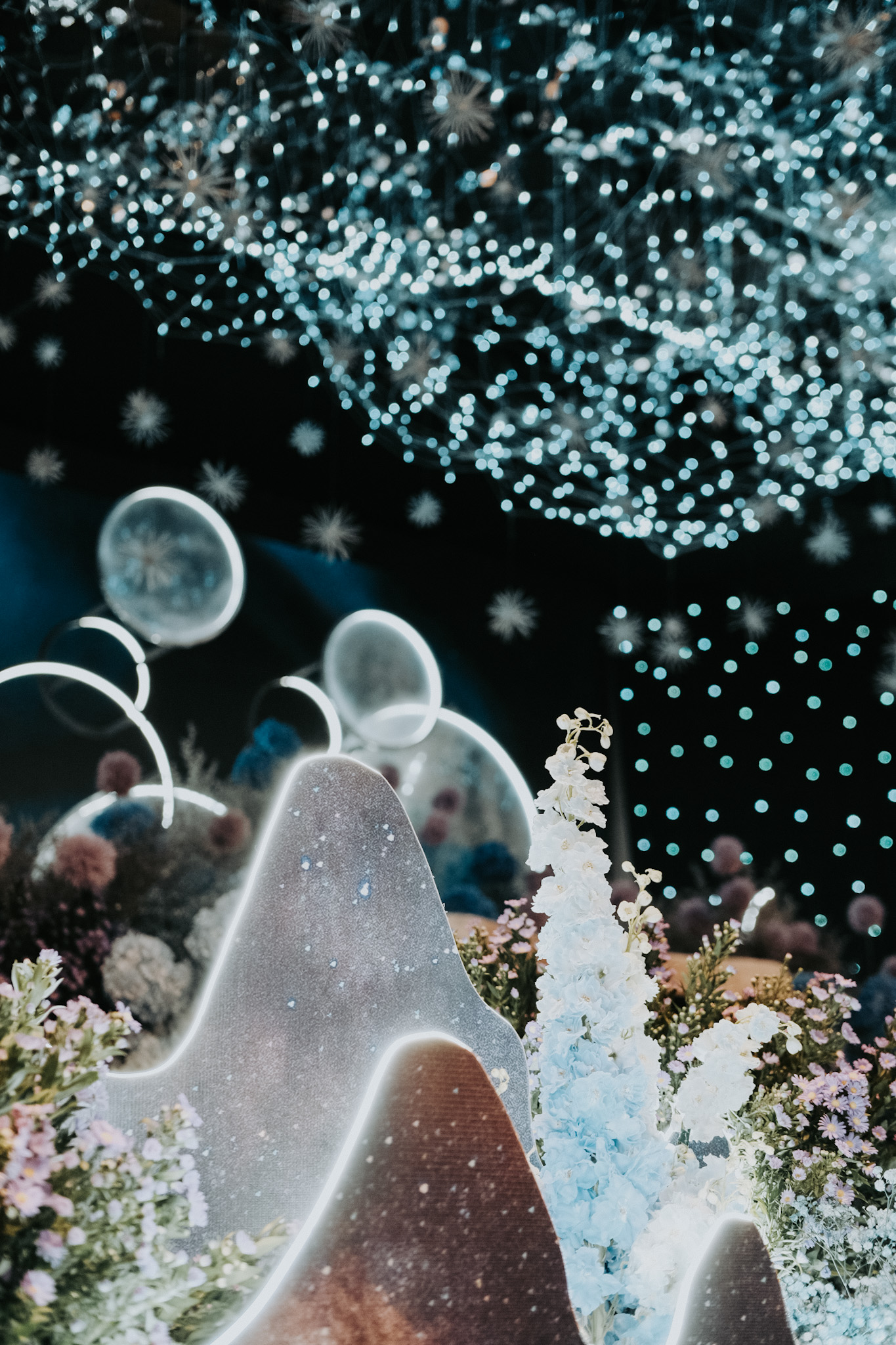 The pièce de résistance is an array of spherical props, with its soft glow, frosty and textured as symbols to a moon’s cratered. Complemented by strings of light that trace the silhouettes of imaginary mountains, mimic the ebbs and flows of orbits and landscapes not of this world.