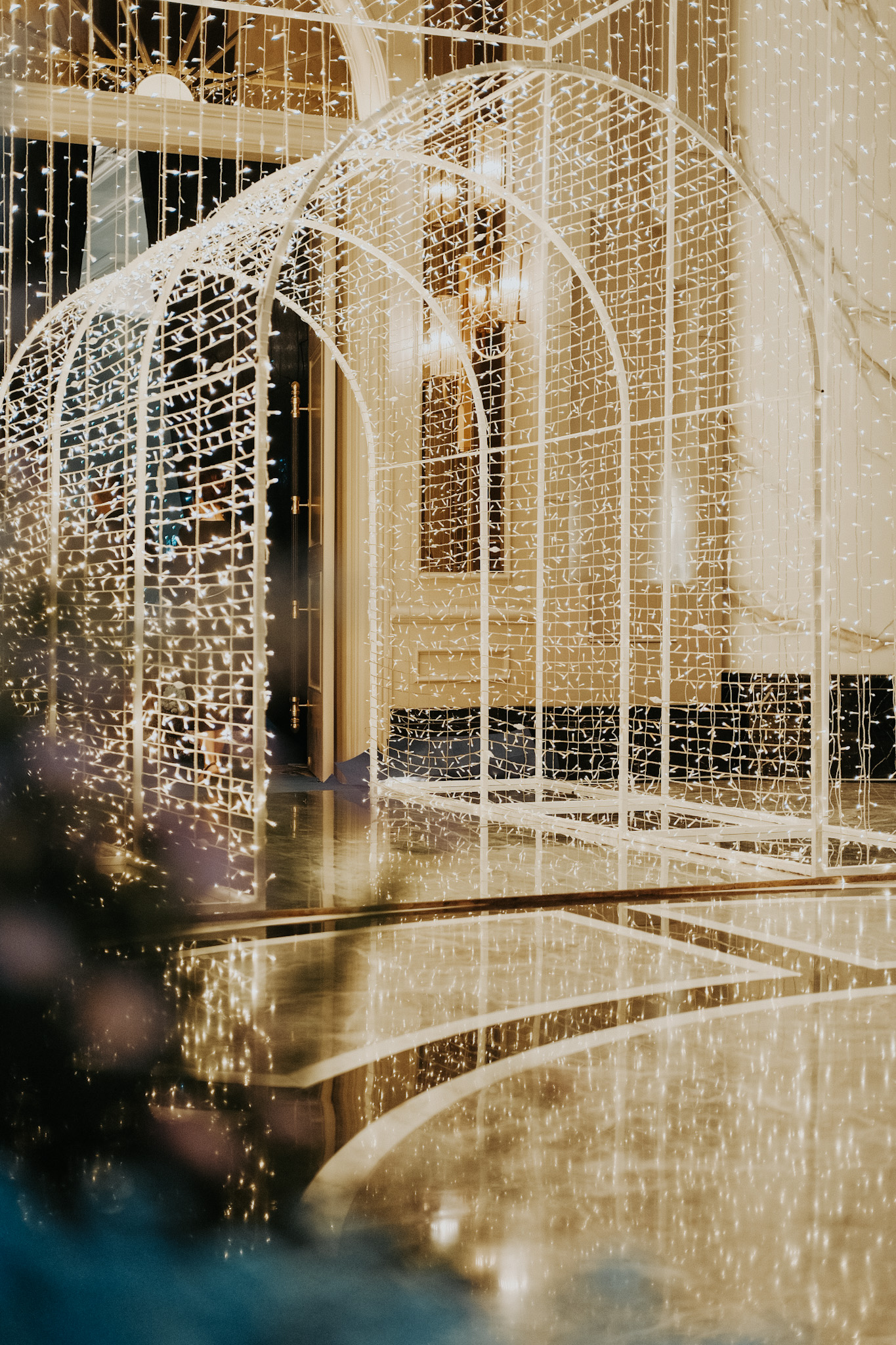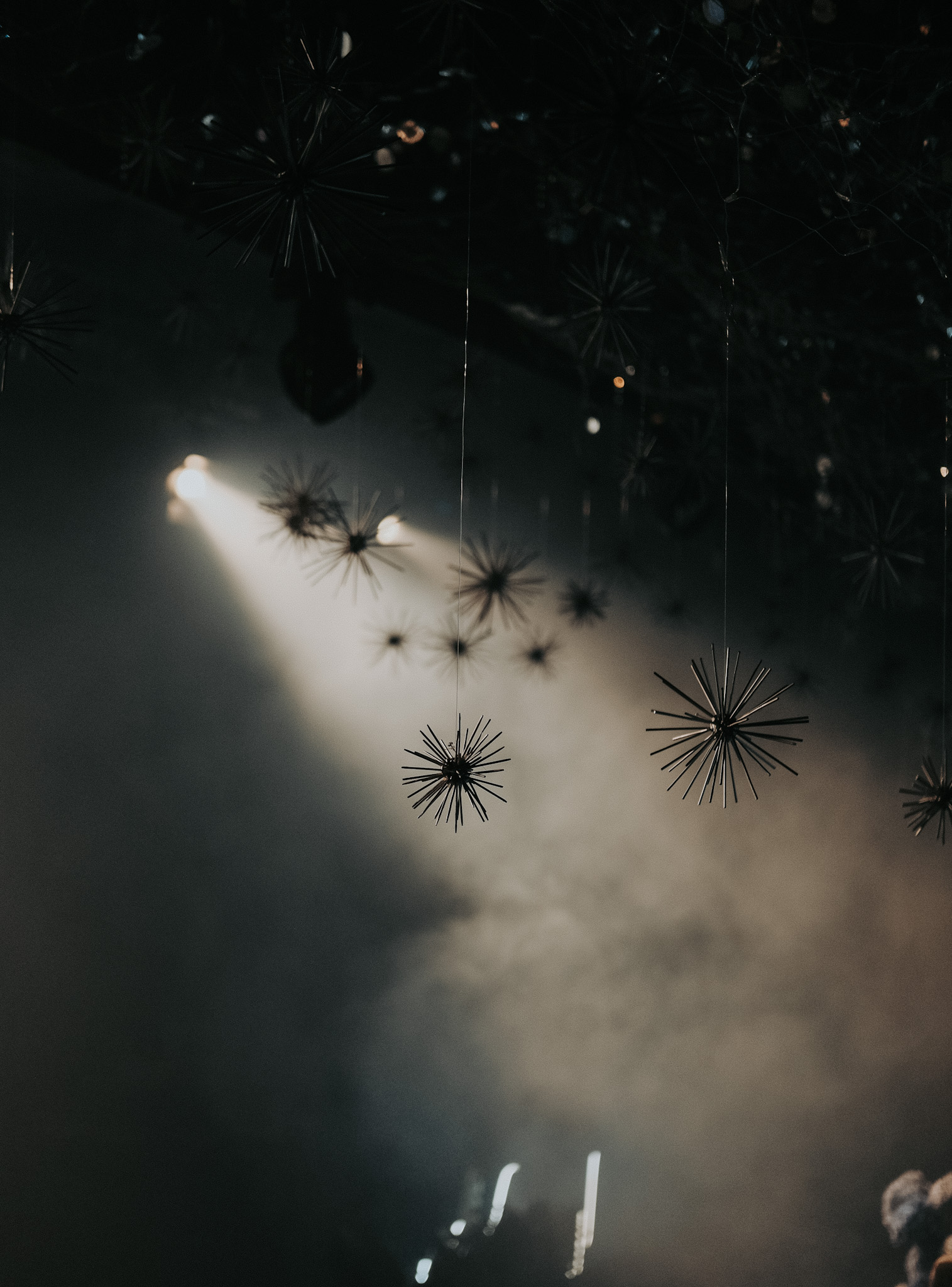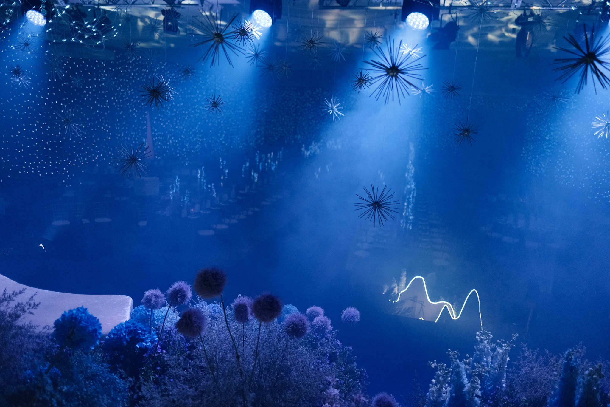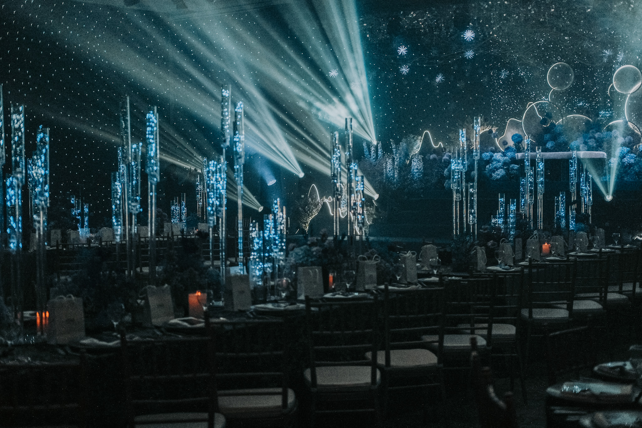 The pièce de résistance is an array of spherical props, with its soft glow, frosty and textured as symbols to a moon’s cratered. Complemented by strings of light that trace the silhouettes of imaginary mountains, mimic the ebbs and flows of orbits and landscapes not of this world.