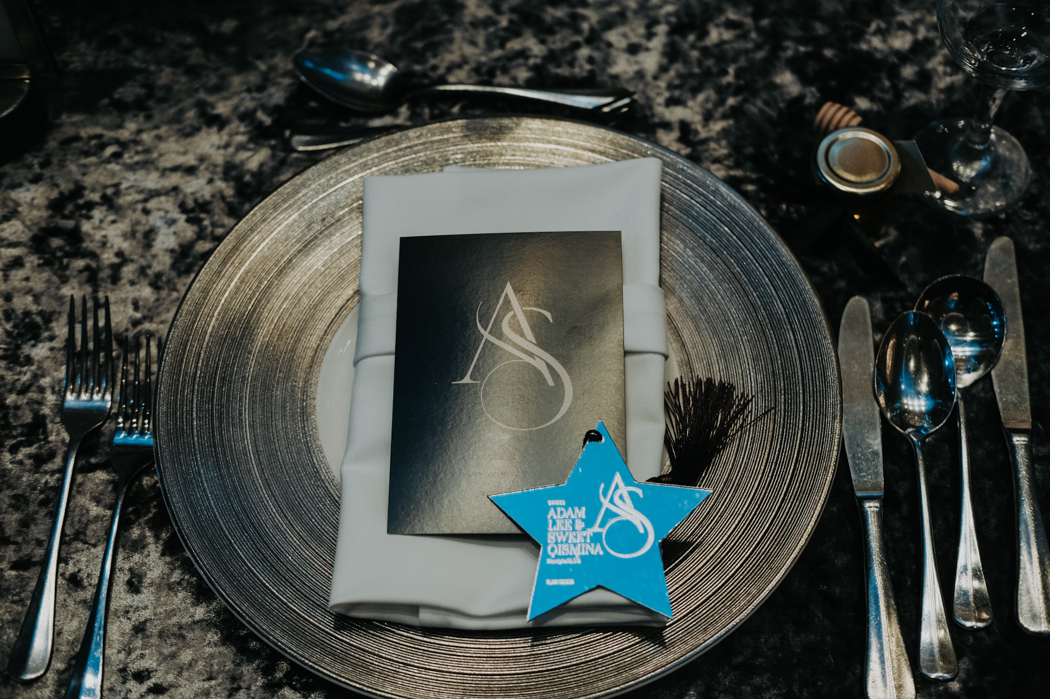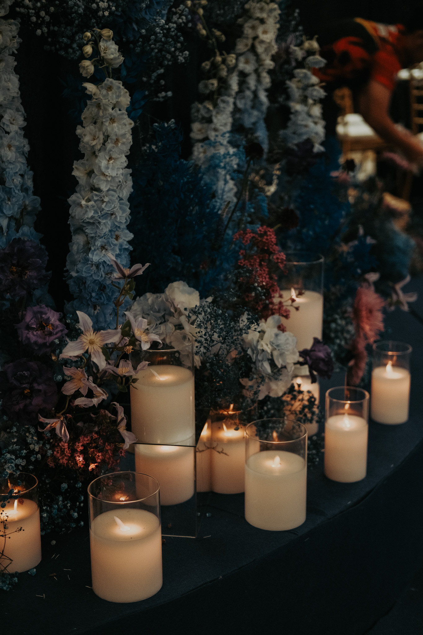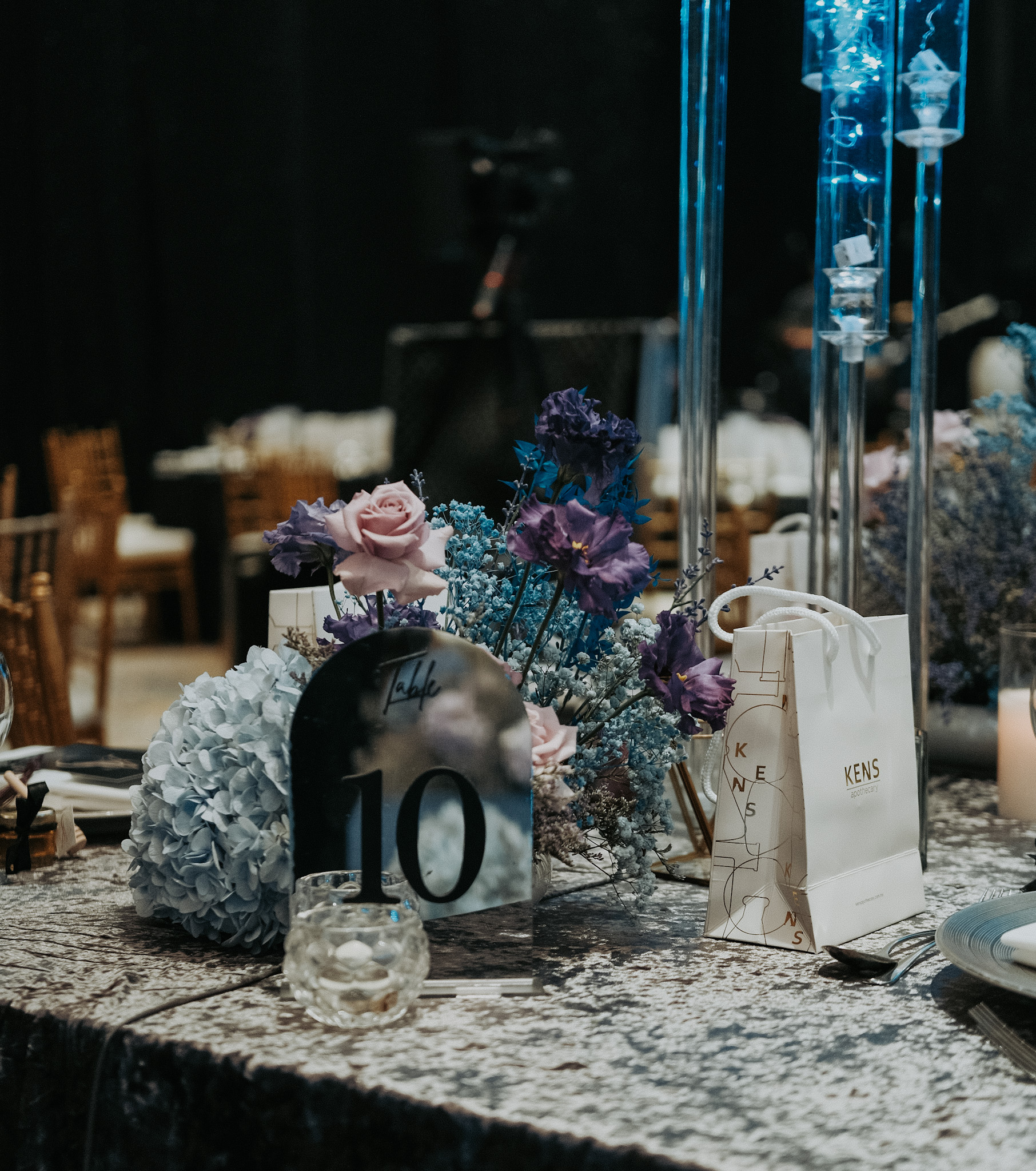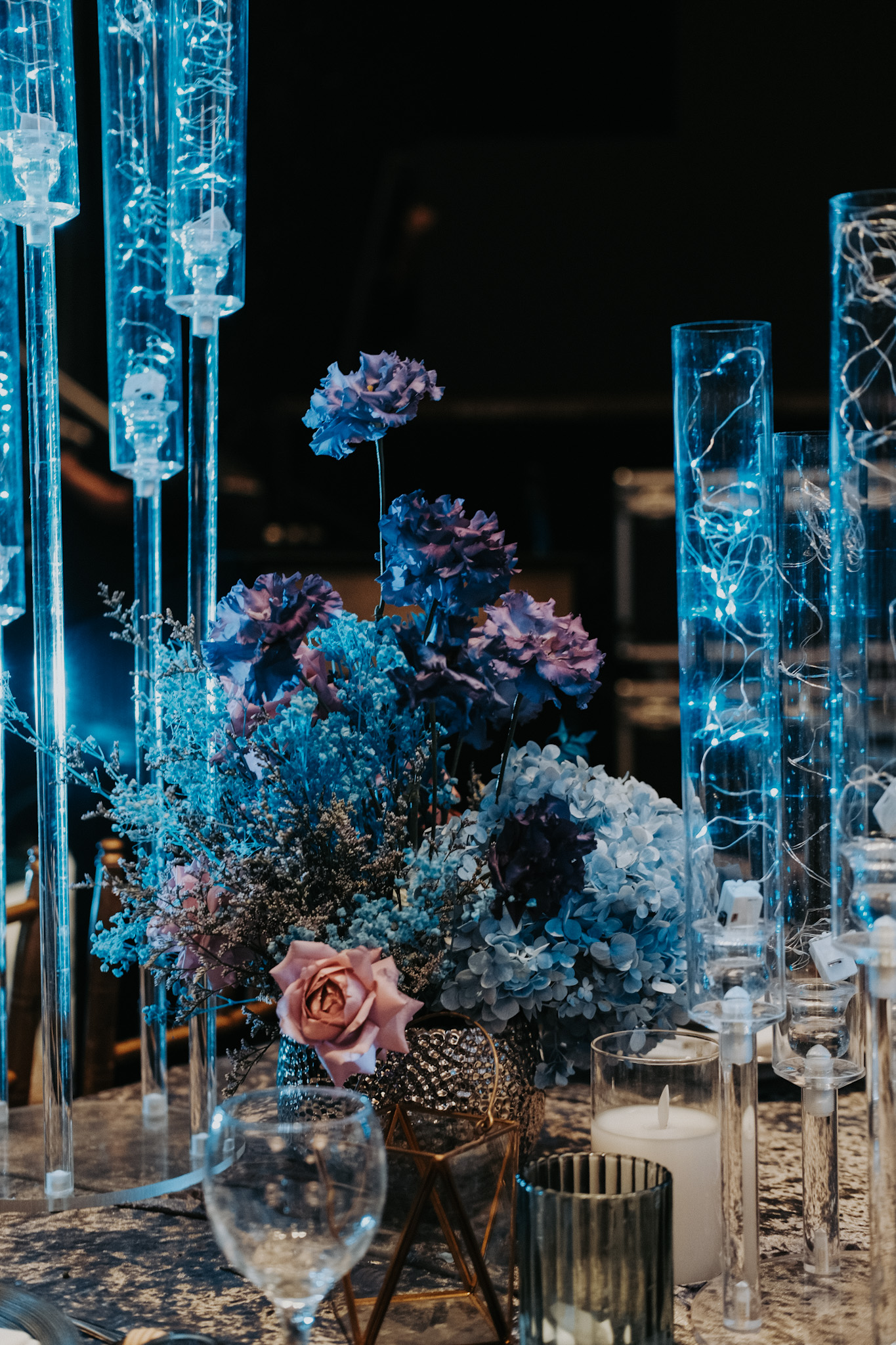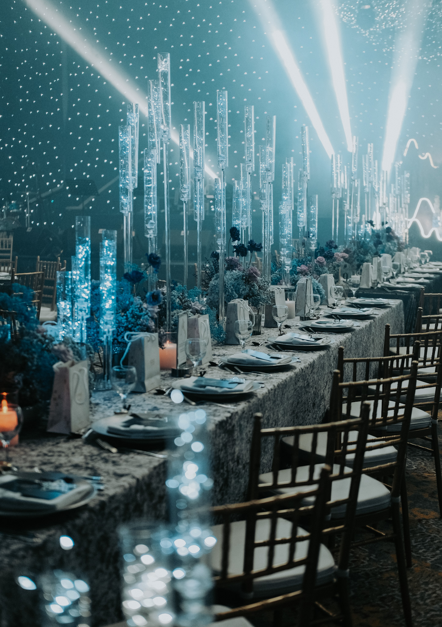 The linens with subtle shimmer, candelabra filled with fairy lights as an illusion of miniature galaxies spiralling. The centrepieces are flanked by floral arrangements in deep blues and purples, adding organic texture to the sleek of the table decor.