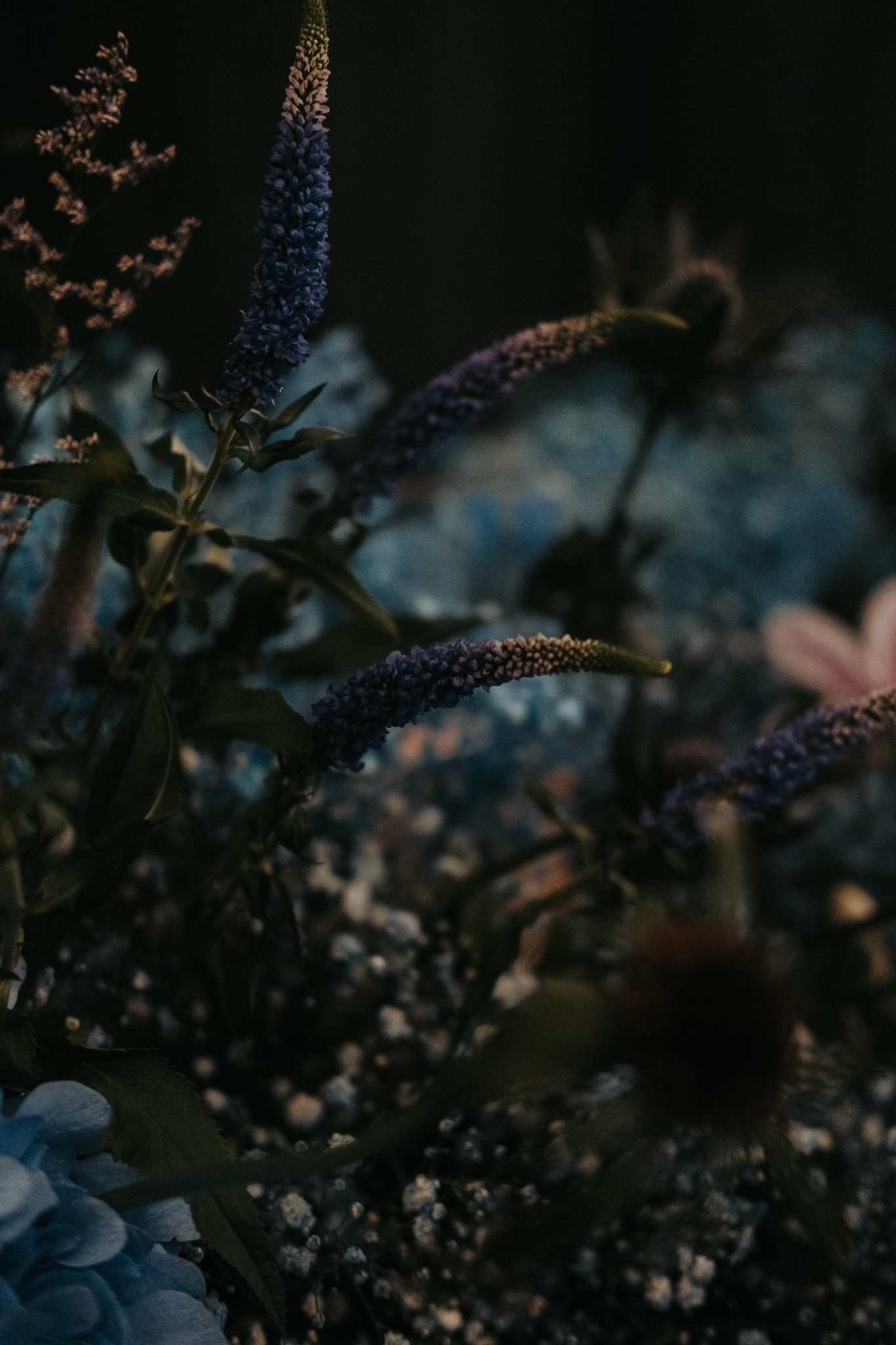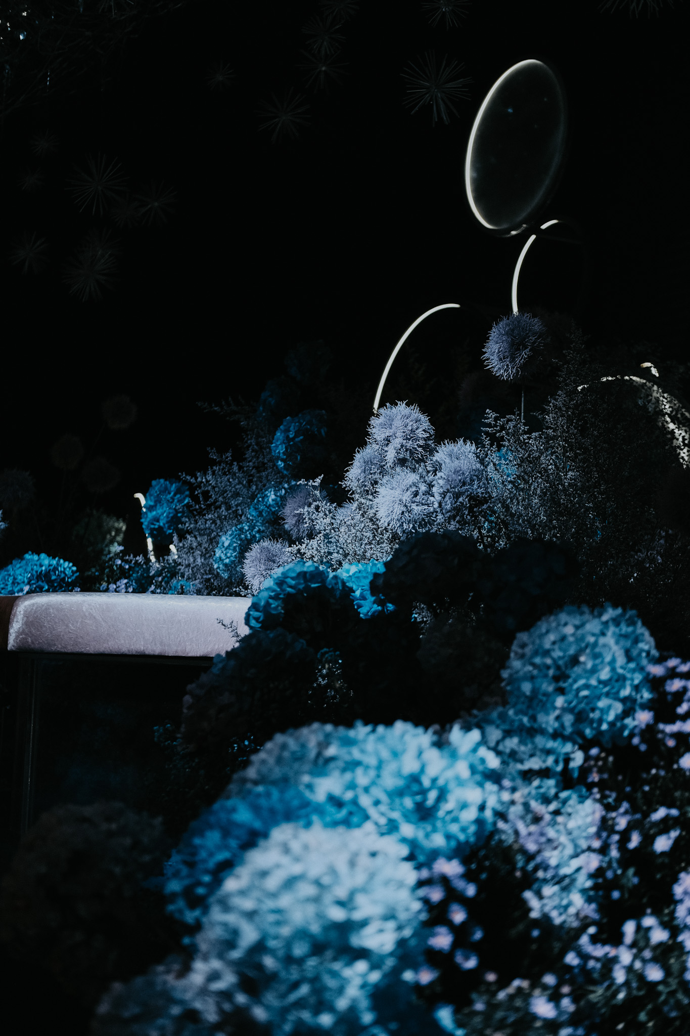 The floral styling was solely to resemble a terrestrial milky way. Hydrangeas, suggestive of nebulous clouds to mirror the depth of the night sky styled to give an impression of a flowering meadow under a starlit sky.